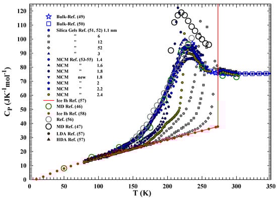 Figure 1 illustrates the water data, experimentally measured and evaluated by means of recent MD simulations at ambient pressure, under different conditions. Specifically, the figure reports data measured in bulk water (in the range K, thus including the supercooled regime [48,49,50]), confined water [51,52,53,54,55,56], ice Ih [57,58], LDA, HDA [57] and the cited simulation studies with the TIP4P/2005 model potential [46,47]. However, although both the two mentioned MD studies report a maximum in in the same temperature interval (220–230 K), there are some discrepancies about their values that could be associated with the lack of a complete equilibration in the data of ref. [46], especially for the runs at the lowest temperatures (below 170 K). As can be observed, for confined water, some data coming from different experiments and in a very large temperature region (80–300 K, i.e., well inside the no man’s land up to the region of the amorphous ice), are reported. In particular, we report the studies of water confined in: (i) silica gels with pore sizes in the range of 1.1–5.2 nm: [51,52]; (ii) cylindrical MCM nanopores with different sizes in the range of 1.4–4.2 nm [53,54,55]. More precisely, the Figure 1 data deal with silica gels—CARiACT—(, 3, 6, 12, and 52 nm pore sizes) and MCM nanotubes coming from previous [53,54,55] (, , nm) and new experiments (, 2, and nm). New data were acquired by using the same experimental procedure and conditions reported in ref [55]: the same heating and cooling rate of 12 K/h. The specific heat of water in a silica xerogel matrix (with a rather narrow distribution of pore sizes and an average dimensions of about 2 nm) [56,59], is also reported for comparison. The red line and red data points deal with the of ice Ih [57,58]. The illustrated data come from two different experimental techniques: adiabatic method [51,52] and the usual differential scanning calorimetry (DSC). In particular, the new data were acquired with this last technique (the same previously used for MCM samples, hydrated after a complete drying [55]) working with a Perkin–Elmer DSC 8500. The heat capacity of the water within the pores is derived by subtracting, from the heat capacity of the sample, the contributions of the excess water. The first method has been just developed to account for the specific properties of a glass as it ages, and it can be used to separate the properties of water around the surface from those of the internal one. It is, however, surprising to see the agreement between the data of confined water and those of the MD simulations [46].