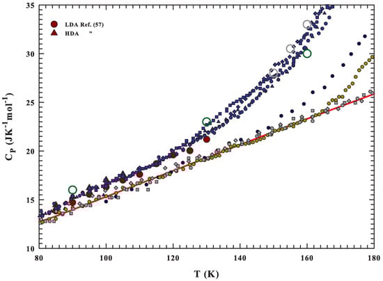 The data of Figure 1 reported in an enlarged temperature scale (80–180 K). The values of LDA and HDA are reported as dark red circles and triangles, respectively [57].
