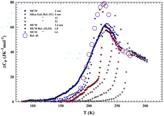 - Nagoe, A.; Kanke, Y.; Oguni, M.; Namba, S. Findings of Cp Maximum at 233 K for the Water within Silica Nanopores and Very Weak Dependence of the Tmax on the Pore Size. J. Phys. Chem. B 2010, 114, 13940–13943. [Google Scholar] [CrossRef]