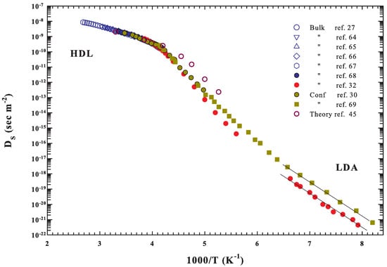 The data measured, at the ambient pressure, in bulk [49,50], confined water [51,52,53,54,55,56] and those obtained by the two mentioned MD simulation studies [46,47]. Specifically, the bulk water data cover the range K (thus including the supercooled regime), wheras confined water data are measured under different confining materials with various pores in the range K. The figure also reports data of ice Ih 10–273 K [57,58], of LDA and HDA [57].
