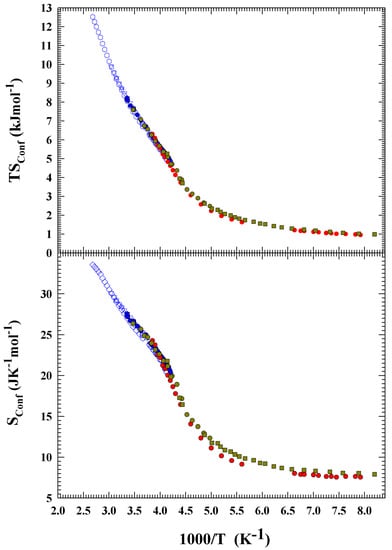 The experimental data in Figure 4 cover a very large temperature range from 373 to 120 K, with an overall variation of about 12 orders of magnitude without the presence of singularities. However, although inside the supercooled regime there is a difference of about an order of magnitude in , the Arrhenius behavior of confined and “bulk” data is essentially the same. From these data, a fragile-to-strong transition (or dynamic crossover) just at ∼ 225 K ( K) and a second crossover at ∼ 187 K ( K) to a lower activation energy, are observable as predicted [70]. Hence, the water configurational entropies are obtained from these data according to the AG prediction equation: