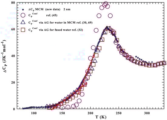 The difference between the measured specific heat of water and ice . According to ref. [45], such a quantity gives a good estimation of the configurational contribution: . The data deal with water in the following samples: silica gels (6, 12, and 52 nm pore sizes), MCM (, nm [53,54] and 2, nm (new data)). The values coming from thermodynamical considerations are also reported [45].