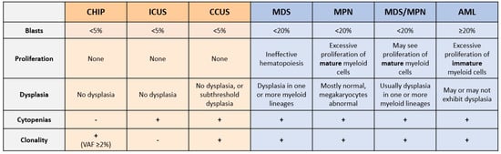 Summary of current pre-neoplastic states and myeloid neoplasms. Pre-neoplastic states (in orange: clonal hematopoiesis of indeterminate potential, CHIP; idiopathic cytopenia of undetermined significance, ICUS; and clonal cytopenias of undetermined significance; CCUS) are classified primarily based on the presence of clonality (acquired DNA variants or chromosomal aberrations), and on the presence of peripheral cytopenias [,]. The main categories of myeloid neoplasm (blue) are primarily classified based on blast percentage (morphologically primitive cells, including HSPCs), by the type of cells that proliferate aberrantly, and by the morphology of the myeloid cells []. VAF, variant allele frequency; MDS, myelodysplastic syndromes; MPN, myeloproliferative neoplasms; MDS/MPN, overlapping MDS and MPN; AML, acute myeloid leukemia.