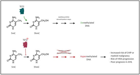 Loss-of-function mutations in TET2 result in DNA hypermethylation. TET2 is an alpha-ketoglutarate- and Fe2+-dependent dioxygenase (α-KGDD) that catalyzes the oxidation of 5-methylcytosine (5mC) to 5-hydroxymethylcytosine (5hmC). This is a required step in proper DNA repair and DNA demethylation (green). Loss-of-function mutations in TET2 in CHIP and myeloid malignancies disrupt this oxidation step and result in a general DNA hypermethylation phenotype (red) and aberrant HSPC self-renewal, which is associated with an increased risk of CHIP, myeloid malignancy, MDS progression, and poor prognosis in AML [].