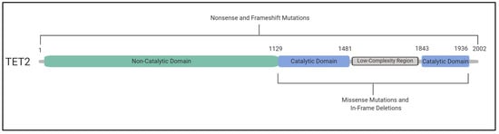 Inactivating TET2 mutations occur throughout the coding region. The C-terminal catalytic domain of TET2 occurs approximately between amino acid residues 1129 and 1936, including a double-stranded β helix and cysteine-rich domain, binding sites for Fe(II) and α-ketoglutarate, as well as a low-complexity linker region. Together, these regions allow the catalytic domain of TET2 to bind to DNA, allowing the oxidation of 5mC to 5hmC []. Missense mutations and in-frame deletions occur in the catalytic domain of the protein (blue). Nonsense and frameshift mutations can occur throughout the entire coding region. However, they occur most frequently in the non-catalytic domain (green). Mutations in TET2 are generally inactivating regardless of their nature or location in the coding region of the gene [,,].
