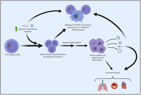 It is well recognized that the prevalence of TET2 somatic variants increases with age [,,]. However, the mechanism for the emergence and subsequent dominance of TET2-mutated clonal populations in elderly people has not been well studied. A recent study by Abegunde et al. (2018) showed that Tet2-knockout murine and TET2-deficient human HPSCs had a proliferative advantage when chronically exposed to tumour necrosis factor alpha (TNF-α) in vitro. Upon prolonged plating with TNF-α, HSPCs with inactivating TET2 mutations developed a resistance to apoptosis and a propensity for myeloid differentiation []. Similarly, upregulated Il6 expression from HSPCs in murine Tet2-knockout mice (in response to acute inflammatory stress) led to apoptotic resistance via increased expression of pro-survival genes and decreased expression of pro-apoptotic genes []. These results suggest that the expansion of TET2-mutated clones may be facilitated by a resistance to an inflammatory environment that these clones help propagate (Figure 4). Furthermore, another group found that microbial signals from the intestine appear to trigger the expansion of myeloid Tet2-deficient clones, where bacterial translocation in Tet2-knockout mice led to increased IL-6 production and myeloid expansion [].