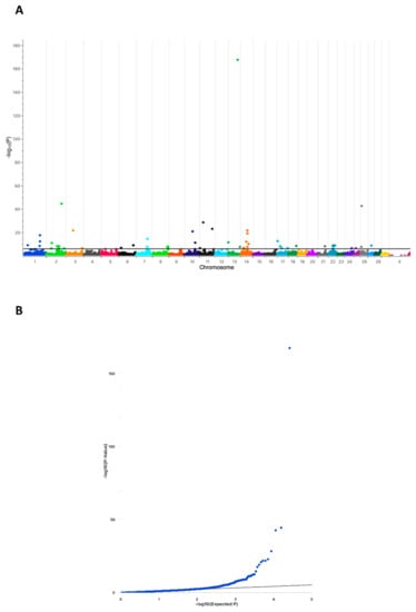 Manhattan plot of the Genome Wide Association Analysis (GWAS) (n = 289; 279 controls, 10 cases). (A) The plot shows the -log10-transformed p-values for all SNPs. The black horizontal line represents the genome-wide significance threshold of −log10P = 5.9. (B) Quantile-quantile (QQ) plot of the GWAS.