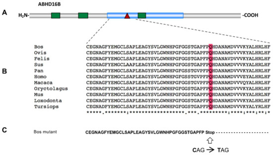 (A) Schematic representation of the ABHD16B protein structure indicates the position of the α/β-hydrolase fold domain (blue) and the transmembrane helices (green), predicted by NCBI Conserved Domains Database and TMbase, respectively. The amino acid position (218) of the nonsense variant leading in a premature stop is marked by a red triangle. (B) The comparative alignment of amino acid sequences of 11 mammals while using Clustal W (178-amino acid position 178–237) is shown. The amino acid position at the truncation site is indicated in red. NCBI protein sequence accession numbers are as follows: Bos (Bos Taurus) NP_001033630.1, Ovis (Ovis aries) XP_014955258.1, Felis (Felis catus) XP_003983341.3, Sus (Sus scrofa) XP_020933693.1, Pan (Pan troglodytes) XP_003317106.1, Homo (Homo sapiens) NP_542189.1, Macaca (Macaca mulatta) NP_001180656.1, Oryctolagus (Oryctolagus cuniculus) XP_008250767.2, Mus (Mus musculus) NP_899004.1, Loxodonta (Loxodonta Africana) XP_003421827.1, Tursiops (Tursiops truncates) XP_019806804.1. (C) The amino acid sequence of bovine ABHD16B truncated protein with the stop-gain variant.