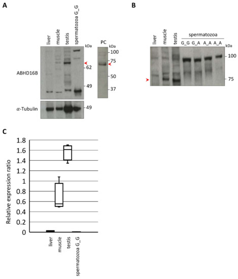 Western blot analysis of ABHD16B protein expression in tissues and spermatozoa. (A) ABHD16B protein band (red arrow) detected in wild type testis (G_G) but not in spermatozoa. Using liver as negative control, muscle and human ABHD16B over-expression lysate as positive controls (PC). α-Tubulin used as the loading control. (B) ABHD16B (approx. 70 kDa) is absent in spermatozoa of three genotypes (wild type (G_G), heterozygous (G_A) and homozygous carrier (A_A)). Spermatozoa of homozygous carriers were from Tarantino and Ca. (C) Box and Whisker plot of relative ABHD16B expression. Areas under curve were determined using ImageJ 1.52k software and relative expression ratios of ABHD16B (%) in liver, muscle, testis, and spermatozoa (G_G) were calculated while using α-Tubulin expression as internal standard. Horizontal lines within boxes indicate median values and whiskers show upper and lower extremes.