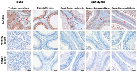 Testicular and epididymal tissues were obtained from freshly slaughtered wild type Holstein cattle and they were immediately fixed in 4 % formaldehyde for 48 h. Immunohistochemistry (IHC) was performed on paraffin-embedded sections, including testicular parenchyma, as well as ductuli efferentes, epididymal head, corpus, and tail with efferent ducts and epididymal duct, respectively. The primary polyclonal antibody was directed against the PAC-ARK peptide and it was generated in the rabbit according to standard protocols (Davids Biotechnologie GmbH, Regensburg, Germany). IHC was performed in an automated immunostaining system (Discovery XT, Roche Diagnostics GmbH, Mannheim, Germany) at a dilution of 1:1000 while using the SABC (streptavidin-biotin-complex) method, mild EDTA (ethylenediaminetetraacetic acid) pretreatment, and DAB (diaminobenzidine tetrahydrochloride) for signal detection (DAB Map Kit, Roche Diagnostics GmbH, Mannheim, Germany). A rabbit IgG isotype control (ABIN3023746, antibodies-online GmbH, Aachen, Germany) was included at the same concentration as the primary antibody for confirmation of primary antibody specificity. Additionally, pure antibody diluent instead of primary antibody was applied to the control sections for an evaluation of non-specific binding of the secondary antibody.
