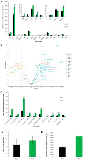 Lipid distribution and variance of spermatozoa in wild type and heterozygous sires. (A) Change profile of total lipid content for each lipid class of sperms in two genotypes. (B) −log10 of adjusted p-value (p(BH)) and mean log2-fold change (G_A vs G_G) of 144 lipid species were plotted, lipid species with −log10p(BH) >1.3 and |log2fold change|>1 (dashed grey lines are included) were annotated with lipid feature names (simplified without the saturated acyl groups). (C) Top 10 most significantly changed lipid species between G_G and G_A bull sperm cells. (D) Bar chart shows the mean of PC:PE ratio in G_G and G_A bull sperms. (E) Bar chart shows the ratio between LPC 22:6 and PC 16:0_22:6 in two genotypes. G_G: wild type; G_A: heterozygous. Differential changes were tested by the Mann–Whitney U test or Student’s t-test. Data are presented as mean ± SEM; n = 15/group; FDR adjusted p-values are indicated: * p < 0.05, ** p < 0.01, *** p < 0.001.
