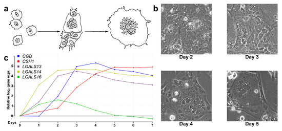 Next, we aimed to explore how PPE genes are regulated in the context of the transcriptomic and functional changes during villous trophoblast differentiation. Therefore, we performed a 7-day RNA microarray and qRT-PCR expression profiling experiment. As illustrated in Figure 2, the classical morphological changes of villous trophoblast differentiation were detected (Figure 2b), and the expression changes of five PPE genes were in accordance with previously published data [19,57] (Figure 2c). There was a good correlation between microarray and validation qRT-PCR data throughout the differentiation process for all eight validated genes, thus further corroborating our experiment (Figure S3). The correlation between RNA and protein levels was demonstrated for LGALS13 and LGALS14 in earlier work [19].