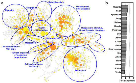 Gene-regulatory networks, biological processes and tissue enrichments in differentiating villous trophoblasts. (a) The network of biological processes enriched among differentially expressed (DE) genes was created by BiNGO and visualized with Cytoscape. Sizes of the circles relate to the number of genes involved in the biological processes and colors refer to p-values. The groups of most enriched biological processes were manually circled and labeled. The color code depicts p-values. (b) The UniProt tissue enrichments among DE genes were assessed with DAVID and are represented in a bar chart in the order of their enrichment significance value.
