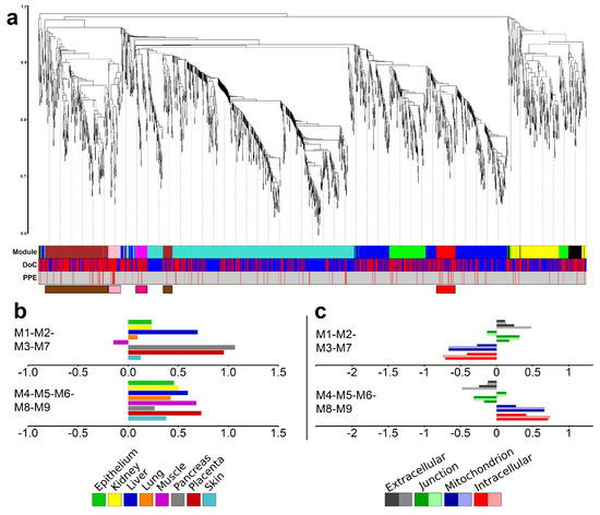 Modules of co-expressing genes. (a) Weighted co-expression network analysis (WGCNA) of differentially expressed (DE) genes identified five major and four minor modules. The y-axis represents the distance metric (1-TOM); the three levels of colored bars below the chart indicate the identified modules, the direction of change of expression (DoC; red: up-regulated, blue: down-regulated), and predominantly placental expressed (PPE) genes. The four modules enriched in PPE genes are depicted in the bottom with module-colored boxes. (b) Tissue enrichments of the combination of placental (M1-M2-M3-M7) and non-placental (M4-M5-M6-M8-M9) modules as analyzed with the DAVID bioinformatics tool. (c) Cellular component enrichments for the same two module groups as analyzed by DAVID.