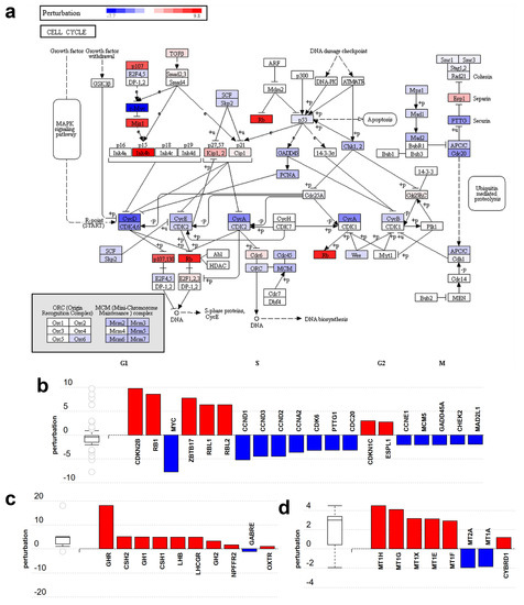 Among the 25 pathways significantly perturbed by non-placental-module gene expression changes, 10 were linked to the cell cycle, proliferation, carcinogenesis, and related signaling processes. Figure 5a depicts the perturbation of genes in the ‘cell cycle’ pathway (KEGG 04110). Genes that encode proteins promoting cell cycle progression, e.g., c-Myc (MYC) and cyclins (CCN genes), are down-regulated while tumor suppressors such as Rb (RB1) and p15 (CDKN2B) are up-regulated (Figure 5b).