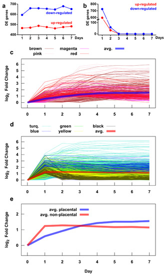 Time course of gene expression during villous trophoblast differentiation. The number of up- and down-regulated genes during differentiation was assessed by comparing mean gene expressions on a given day versus day 0 (a) and versus the previous day (b). The time course of expression changes, measured as the absolute value of the log2 fold change, of genes in placental (c) and non-placental (d) gene modules. The colors correspond to the module colors defined in Figure 4. The average expression time courses for the two module groups are shown in (c,d) with thick lines and are compared directly in (e). See Figure S6 for expression time courses for each gene module.