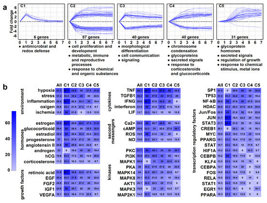 The analysis of common regulators of clusters with immediate expression change (clusters 1–3) revealed cytokines (e.g., TNF, TGFB1), hormones (estrogen, glucocorticoids, progesterone, angiotensin), growth factors (e.g., retinoic acid, EGF, FGF, IGF), and environmental factors (e.g., oxygen, stress, inflammation), which critically regulate events early in differentiation. Their signals are transmitted predominantly by various second messengers (e.g., calcium, cAMP, ROS), kinases (e.g., PKC, PI3K, MAPK), and transcription factors (e.g., SP1, TP53, NF-kB, AP1) (Table S8, Figure 7b).