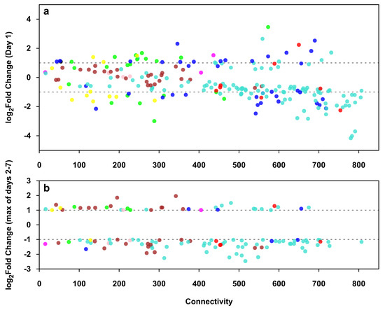 Figure 8 shows the relation of connectivity (degree of the TR gene in the co-expression network) and expression change of differentially expressed TR genes of trophoblast differentiation on day 1 (Figure 8a) and on days 2 to 7 (Figure 8b), the latter showing only the TR genes not differentially expressed on day 1 (Figure 8b). On day 1, TR genes in the non-placental modules were already mostly differentially expressed, while on days 2 to 7, most of the placental module TR genes became differentially expressed. The majority of differentially expressed TR genes were down-regulated in both time periods. TR genes with higher connectivity tended to have a higher fold change, and those with the highest connectivity belong mostly to non-placental modules. Differentially expressed TR genes showed the same general dynamics as other DE genes during differentiation: a rapid and profound initial change in the regulation of non-placental gene modules, followed by slower and more limited placenta-specific transcriptional changes, leading to the completion of trophoblast differentiation.