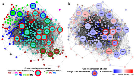Co-expression network of transcription regulatory genes involved in villous trophoblast differentiation and preterm preeclampsia. The co-expression network of 220 DE transcription regulatory genes is shown; genes with an absolute expression correlation coefficient >0.9 are connected. The 20 genes that are also differentially expressed in preeclampsia [57] are shown in larger size. (a) The relationship of villous trophoblast (VT) differentiation gene modules and preterm preeclampsia DE gene modules. Node color represents VT differentiation gene module (colors are defined in Figure 4), while border color of the large nodes represents preeclampsia gene module as defined earlier [57]. (b) Relationship between fold changes during VT differentiation and in preterm preeclampsia. Node color indicates the log2 fold change of genes in VT differentiation, while border color of the large nodes indicates log2 fold change in preterm preeclampsia [57]. (Visualizations created with Tabnetviz (git.io/tabnetviz)).
