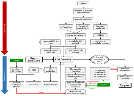 Overview of targets of RLX in IRI. In IRI setting, RLX has anti-inflammatory effect by reducing expression of intracellular adhesion molecule 1 (ICAM-1), inducing expression of Notch1 in macrophages and by reducing neutrophil adhesion through increased synthesis of nitric oxide (NO) [30,36]. Furthermore, it acts as an anti-apoptotic agent in hepatocytes by binding to the glucocorticoid receptors (GR) and inhibiting release of cytochrome c from mitochondria [31]. Lastly, RLX causes vasodilation through increased NO production, which acts as a vasodilator and reduces vasoconstriction by inhibiting endothelin 1 (ET-1) production [38]. (ROS—reactive oxygen species, MPTP—mitochondrial permeability transition pore).