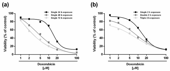 According to the literature [22,57], our results showed that the cytotoxicity of doxorubicin increased with the exposure time, as shown by the IC50 reduction, by 4-fold and 9-fold after the treatments of 48 h and 72 h, respectively, with respect to 24 h. Moreover, metronomic conditions allowed us to achieve a cytotoxicity similar to that found after 48 h, mainly increasing the efficacy of low-dose doxorubicin.