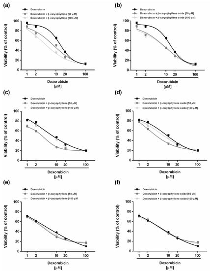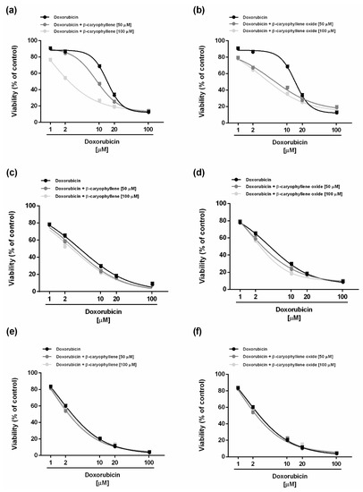Moreover, combining doxorubicin with the higher chemosensitizing concentration (100 μM) of β-caryophyllene further enhanced its cytotoxicity with respect to the lower chemosensitizing dose, in spite of a null potentiation produced by β-caryophyllene oxide (Figure 3a,b). Particularly, β-caryophyllene 100 µM produced a potentiation from 10% to 37% of low concentrations (i.e., 1–10 μM) of doxorubicin. The IC50 value of doxorubicin reduced by 1.6-fold to almost 4-fold in combination with β-caryophyllene, whereas it reduced by about 2-fold in combination with β-caryophyllene oxide (Table 3).