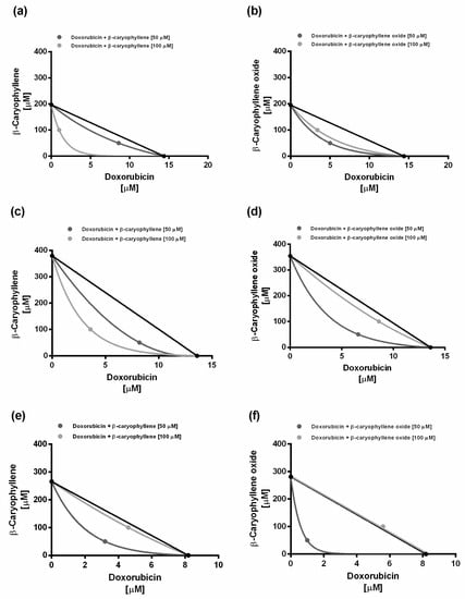 Isobolographic analysis of the cytotoxic effect obtained with the combination of doxorubicin and β-caryophyllene or β-caryophyllene oxide at the chemosensitizing concentrations of 50 and 100 µM in HepG2 cells. (a,b) Long-term exposure of 24 h. (c,d) Short exposure of 2 h. (e,f) Double exposure of 2 h.