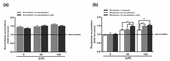 On the basis of the accumulation assay results, the combined treatment of doxorubicin and caryophyllane sesquiterpenes seems to affect the efflux pumps in HepG2 cells. Accordingly, our previous study highlighted that caryophyllane sesquiterpenes affected the efflux of sorafenib, mainly mediated by MRP1 and MRP2 and partly by MDR1, in Alexander and Hepa 1–6 cells [16].