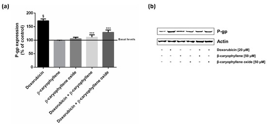 Effect of the sesquiterpenes β-caryophyllene and β-caryophyllene oxide on P-gp expression induced by doxorubicin in HepG2 cells. The cells were exposed to caryophyllane sesquiterpenes (50 µM), doxorubicin (20 µM) or their combination for 2 h. Then, the pellets were harvested for the western blotting analysis. The basal level represents the P-gp expression in the vehicle control. (a) Densitometric bar graph analysis obtained from at least two independent replicates. Data are expressed as mean ± standard error. (b) Representative western blotting image showing the expression levels of P-gp and β-actin used as protein loading control. *** p < 0.001 (t-Student test), significantly lower than doxorubicin. § p < 0.001 (t-Student test), significantly higher than the vehicle control (basal level).
