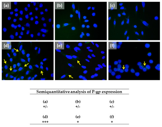 At the immunofluorescence analysis, the cells treated with doxorubicin displayed a significant increased expression in P-gp compared the control cells (Figure 7a,d). By contrast, the presence of P-gp was downregulated in the combinations of the anticancer drug and both the caryophyllane sesquiterpenes with respect to doxorubicin (Figure 7d–f). The sesquiterpenes alone did not affect P-gp expression (Figure 7a–c).