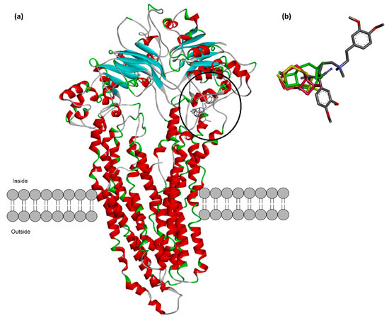 Predicted active site has been circled in the figure for the caryophyllane sesquiterpenes. (a) The common binding site predicted for verapamil and the caryophyllane sesquiterpenes is shown as circled. (b) Binding conformation of verapamil (colored by atom), α-caryophyllene (yellow), β-caryophyllene (red) and β-caryophyllene oxide (green).