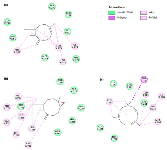 The 2D-map of caryophyllane sesquiterpenes (Figure 9), representing the binding conformation of the tested compounds in the predicted binding site of P-gp, also displays the amino acid residues involved in the interaction and shows that nonpolar interactions such as van der Waals and pi-alkyl are exclusively formed. The contribution energy per residue to the binding energy showed that α-caryophyllene has the worst interaction pattern since there are a lot of positive values (Figure 10; brown line) in the energy of interacting amino acids with the ligand. Moreover, β-caryophyllene (Figure 10; blue line) has more negative and less positive values in interacting amino acids than β-caryophyllene oxide (Figure 10; green line).