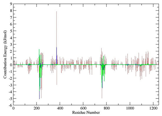 An overlay graph of contribution energy per residue to the binding energy (kJ/moL) for the three caryophyllane sesquiterpenes. Brown line represents contribution energy of α-caryophyllene, blue line represents β-caryophyllene and green line denotes β-caryophyllene oxide.