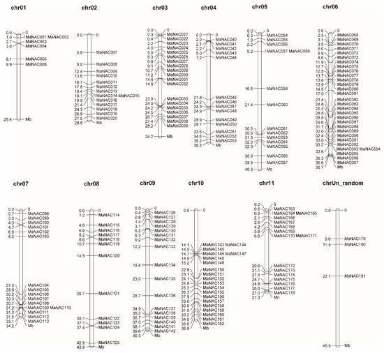 Chromosomal locations of NAC genes in M. acuminata. The chromosomal position of each MaNAC was mapped according to the genome of M. acuminata. The chromosome number is marked at the top of each chromosome and the unit for the scale is megabases (Mb).