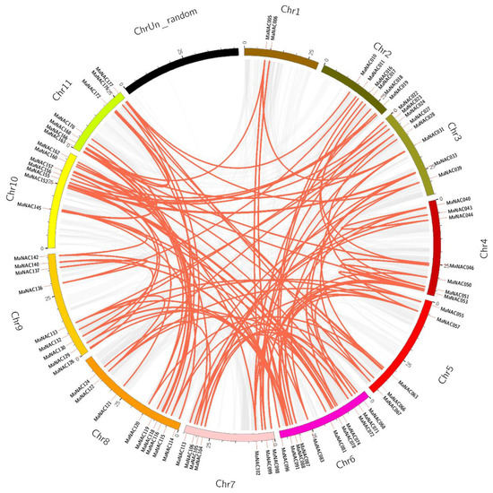 Schematic representation of the interchromosomal relationships of NAC genes in M. acuminata. Gray lines indicate all syntenic blocks in the banana genome, whereas orange lines suggest duplicated NAC gene pairs. The chromosome number is indicated at the top of each chromosome (color figure online).