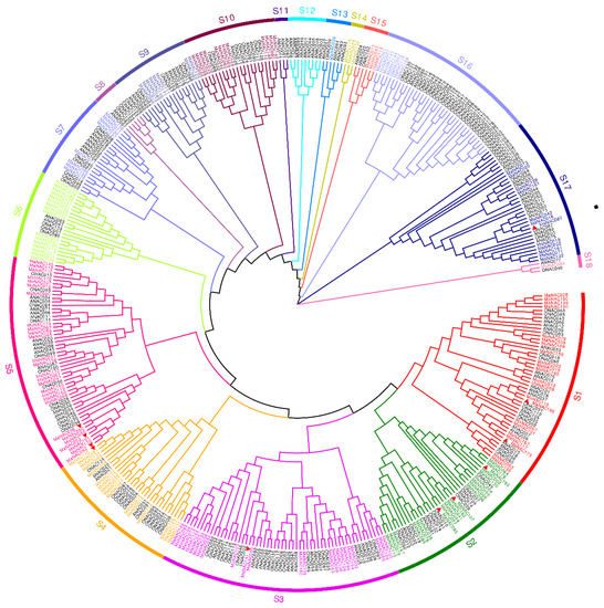 To investigate the evolutionary characteristics of the NAC gene family, comparative phylogenetic and subgroup analyses of NAC protein sequences from banana, Arabidopsis, and rice were conducted. Figure 3 clearly shows that the phylogenetic tree divided the NAC family proteins into 18 distinct subgroups, consistent with the classification of NAC from Populus trichocarpa [9], and were numbered S1–S18 successively. Remarkably, none of the MaNAC genes was distributed in the S8, S11, and S12 subgroups, and ANAC065, ONAC005, ONAC015, ONAC048, and ONAC059 were excluded from the phylogenetic analysis since they formed individual subgroups without any MaNACs and were also located in the highest clades of the tree. This finding suggests the loss of these corresponding members during the divergence of M. acuminata. Interestingly, in addition to the clades containing only Arabidopsis, all the other subgroups included NAC genes from both monocots and dicots, which does not coincide with the results reported by Le et al. [8], who claimed that NACs from monocots and dicots are evolutionarily distinct.
