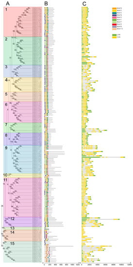 Based on the alignment of the proteins from 181 MaNACs, a phylogenetic tree (Figure 4A) was constructed using MEGA 7.0 by the neighbor-joining (NJ) method with 1000 bootstrap replicates. The motif architectures and gene structures of 181 MaNACs were annotated within the phylogenetic context and visualized by TBtools [49], as illustrated in Figure 4B,C. According to frequencies of occurrence, motif 1 and motif 2 were the two most frequently presented motifs, covering almost all the subgroups from S1 to S14. Motif 10 was a specific motif that was solely detected in S15. Subgroup S11 contained the largest number of motifs, from motifs 1 to 9. To gain more insight into the evolutionary relationships within the banana NAC gene family, the exon–intron organizations of all MaNAC genes were examined. As shown in Figure 4C, among the 181 MaNACs, 7 had no introns, 174 possessed two to 14 exons (6 with two exons, 129 with three exons, 8 with four exons, 16 with five exons, 9 with six exons, 5 with seven exons, and 1 with 14 exons). In addition, a phylogenetic tree of all 181 MaNAC genes divided them into 15 subgroups (Figure 4A). Genes within the same group usually had a similar and conserved structure in terms of exon number and intron length; for example, all the members of groups 1 to 5 contained three exons and two introns. Nevertheless, the gene structures in groups 9, 12, and 15 were variegated and distinct. All introns among the total 181 MaNAC genes were in phase 1, which suggested that they were highly conserved [9]. This result, which is consistent with the NAC genes reported in Populus trichocarpa, indicated that exon shuffling occurred during the evolutionary process [9,50]. The clustered MaNAC pairs presented conserved motifs and exon/intron distributions such as MaNAC181/128, MaNAC004/059, MaNAC019/155, and MaNAC041/107, among others. However, it is worth noting that in the pairs of MaNAC043/113, MaNAC081/127, and MaNAC091/131, the motif compositions were slightly different. Additionally, among the MaNAC146/171 and MaNAC171 pairs, one contained one more exon/intron than the other. This result indicated that during the structural evolution of MaNAC paralogs, single intron loss or gain occurred. Moreover, the conserved motifs and exon/intron structures of these paralogous pairs further verified the analyses of the phylogenetic tree and duplication events.