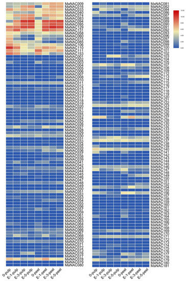Expression patterns of MaNAC genes in the pulp or peel of banana at different intervals after treatment with ethylene (E represents ethylene, the number indicates the days after treatment). The heat map was generated using TBtools. The bar at the right of the heat map represents relative expression values.