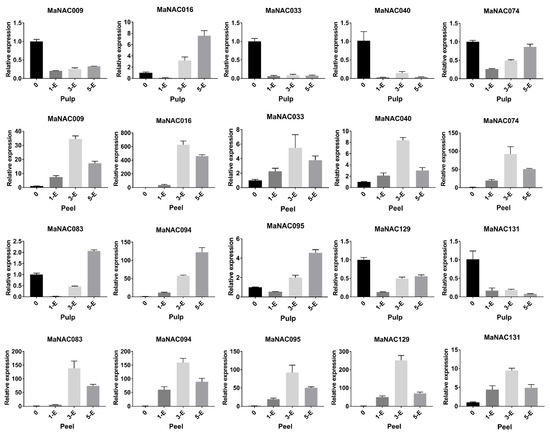 Relative expression of 10 selected MaNAC genes in the pulp or peel of banana at different intervals after treatment with ethylene (E represents ethylene, the number indicates the days after treatment). qRT-PCR data were normalized using the CAC gene. The name of the gene is indicated above each bar diagram. Error bars indicate the standard deviation.