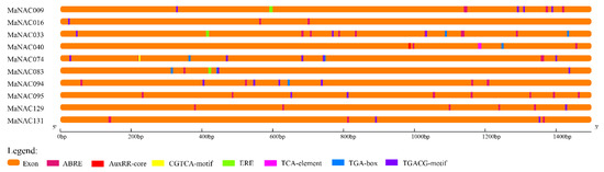 Cis-element analysis of 10 selected MaNAC genes from the upstream 1500 bp sequence to the transcription start site.