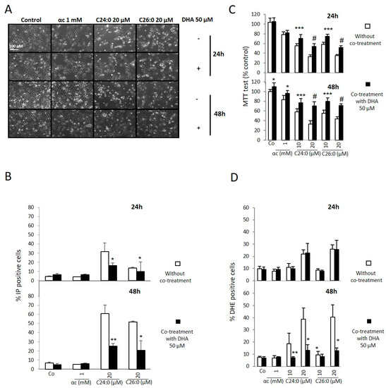 - Zarrouk, A.; Nury, T.; Riedinger, J.M.; Rouaud, O.; Hammami, M.; Lizard, G. Dual effect of docosahexaenoic acid (attenuation or amplification) on C22:0-, C24:0-, and C26:0-induced mitochondrial dysfunctions and oxidative stress on human neuronal SK-N-BE cells. J. Nutr. Health Aging 2015, 19, 198–205. [Google Scholar] [CrossRef]