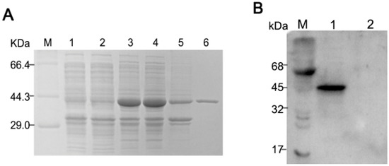 Expression and purification of His-tagged Porcine deltacoronavirus (PDCoV) N-protein. (A) SDS-PAGE of pET28a-N transfected BL21 (DE3) cells. M, protein molecular weight marker; lane 1: E. coli BL21 with empty vector pET-28a (+); lane 2: Uninduced E.coli BL21 with pET-28a-N; lane 3, IPTG-induced pET28a-N transfected cells prior to sonication, lane 4, supernatant of pET28a-N transfected cells post sonication; lane 5: the precipitates of bacterium solution; lane 6: Ni-NTA purified rNP from supernatant; (B) Western blot of E. coli expressed pET28a-N (lane 1) and empty vector pET-28a (lane 2), probed with hyperimmune pig anti-PDCoV.