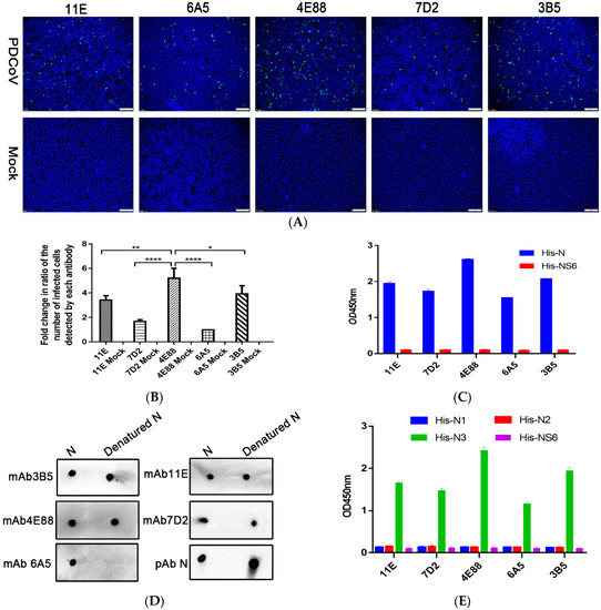 Activity of anti-PDCoV rNP mAbs. (A) Immunoinfluscent assay (IFA) of the five mAbs in PDCoV infected cells. Magnification = 10×; (B) Quantification of the virus-infected cells detected by each monoclonal shown in panel A. * p = 0.0483, ** p = 0.0049, **** p < 0.0001 for 4E88 compared to 3B5, 11E, 7D2, 6A5, respectively; (C) Activity of the antibodies with His-N and His-NS6 by ELISA; (D) Linear epitope identification of five monoclonals by dot blot with denatured and native N protein; (E) ELISA assay of the reactivity of each monoclonal with the N1,N2, and N3 protein. The experiments were repeated three times.