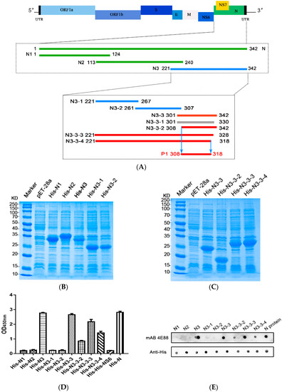 PDCoV CHN-SC2015 genomic RNA was extracted using TRIzol Reagent (Sangon Biotech, Shanghai, China) according to the manufacturer’s instructions. The N gene was amplified by RT-PCR with primers (Table 1) designed with Primer 5.0. The N gene amplicon (1029 bp) was inserted into the pET-28a (+) expression vector (Novagen, Madison, WI, USA) between the EcoR I and Xho I sites. The integrity of the resulting construct (pET28-N) was verified by restriction enzyme digestion, PCR, and DNA sequencing. pET28-N was transformed into Transetta (DE3) Escherichia coli. Protein expression was induced with 0.8 mM isopropyl-β-galactopyranoside (IPTG) for 3 h at 30 °C. Bacteria were collected by centrifugation and lysed by ultrasonication, then centrifuged again; the recombinant N protein (rNP) was purified from the supernatant post sonication by Ni-NTA His-Bind Resin (Bio-Rad, Hercules, CA, USA) according to the instructions. The concentration of the purified rNP was analyzed by SDS-PAGE. Using the same methodology, a series of truncated N-proteins were produced: His-N1, His-N2, His-N3, His-N3-1, His-N3-2, His-N3-3, His-N3-3-1, His-N3-3-2, His-N3-3-3, His-N3-3-4 (Figure 3A).