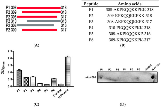 To locate the epitope on N3 recognized by mAb 4E88, three truncations of N3 were constructed: N3-1 (221-267 aa), N3-2 (261-307 aa), and N3-3 (301-342 aa) (Figure 3A). ELISA (Figure 3D) and dot blot (Figure 3E) results showed that mAb 4E88 reacted only with the N3-3 fragment. From here, four truncations of the N3-3 fragment were constructed: N3-3-1 (301-330 aa), N3-3-2 (308-342aa), N3-3-3 (221-328 aa), and N3-3-4 (221-318 aa). N3-3-1 was not expressed successfully, and although mAb 4E88 did react with N3-3-2 the signal was weak. Both N3-3-3 and N3-3-4, which contain most of the N3-3-1 region, reacted with mAb 4E88, but the N3-3-3 region reacted strongly while N3-3-4 reacted somewhat weakly. These results demonstrated that the amino acids 308-318 are at a minimum necessary for the 4E88 interaction. Peptides spanning these amino acids were synthesized (Sangon Biotech, China) (Figure 4A,B) for subsequent experiments.