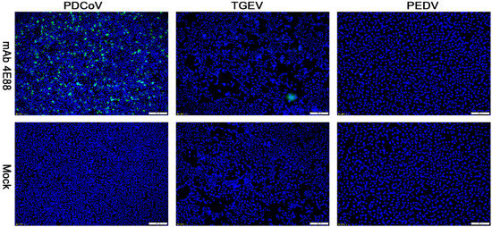 IFA was performed to investigate whether PDCoV cross-reacts with PEDV and TGEV on the epitope of EP-4E88 (aa 309-KPKQQKKPK-317). The mAb 4E88 was used as primary antibody. Figure 5 shows that no fluorescent signals were observed in TGEV infected ST cells and PEDV-infected Vero cells. This result shows that PDCoV EP-4E88 does not cross-react with TGEV and PEDV.