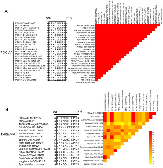To date, six porcine coronavirus diseases (PEDV, TGEV, PRCV, SADS-CoV, PHEV, PDCoV) have been reported [42,43]. Because they present with similar clinical symptoms, diagnosis is a challenge, a sensitive and discriminate serologic method is clearly needed. The PDCoV epitope, 4E88 (aa 309-KPKQQKKPK-317), found in this study shares very low sequence similarity (<22.2%) with other swine coronavirus (Figure 6C), such as PEDV (aa 309-NKRETTLQQ-317) and TGEV (aa 309-SRSKSAERS-317), PHEV (aa 309-QKNGQVEND-317), PRCV (aa 309-SRSKSAERS-317), SADS-CoV (aa 309-SQSQDLNA-317) indicating the EP-4E88 is unique to PDCoV and could be used to distinguish PDCoV and from other swine coronaviruses. Cross-reactivity among swine coronaviruses has been reported and is usually associated with the epitope of N protein [24,26,44]. Lin et al. [24] observed that one-way cross-reaction between TGEV Miller hyperimmune pig antisera and various PEDV strains with the TGEV Miller N protein mAb (14G9.3C) was based on an N protein epitope. Xie et al. [26] found two N-terminal epitopes (58-RWRMRRGERIE-68 and 78-LGTGPHAD-85) of the PEDV N protein contribute to the cross-reaction between PEDV and TGEV. Ma et al. [44] found that N protein is responsible for two-way cross-reactivity between PEDV and PDCoV; four regions (47-GYW-49, 67-FYYTGTGPRGNLKY-82, 194-PKG-197, and 329-EWD-332) are highly conserved and likely account for the cross-reaction [44].