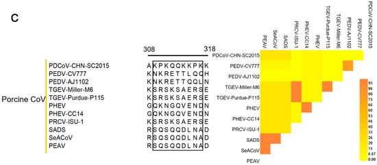 PDCoV is the only porcine deltacoronavirus; sequence alignment of the 4E88 epitope with other porcine coronaviruses was performed to determine conservation among coronavirus genera. The results showed very low sequence similarity, the highest being 22.2% (Figure 6C).