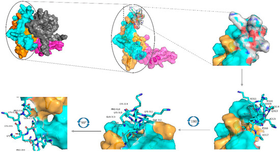 Model of the I-TASSER predicted 3D structure of the N-protein, visualized using the PyMOL molecular graphics and modeling system. The overall structure is shown on the upper left, the yellow areas represent aa231-291, blue areas represent aa292-342, grey areas represent aa1-171, and pink areas represent aa172-230. The EP-4E88 residues (aa 309-KPKQQKKPK-317) are shown as a stick figure and are displayed at different angles of rotation.