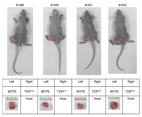 2.5. Cas9-Mediated TERT Haploinsufficiency Severely Compromises the In Vivo Growth of Cancer Cell Xenograft